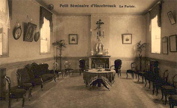 Vue du parloir vers 1930. Les fauteuils remplacent désormais les chaises et le chauffage central a fait son apparition. Sur les murs, les photographies représentent les anciens élèves devenus évêques ou supérieurs.
